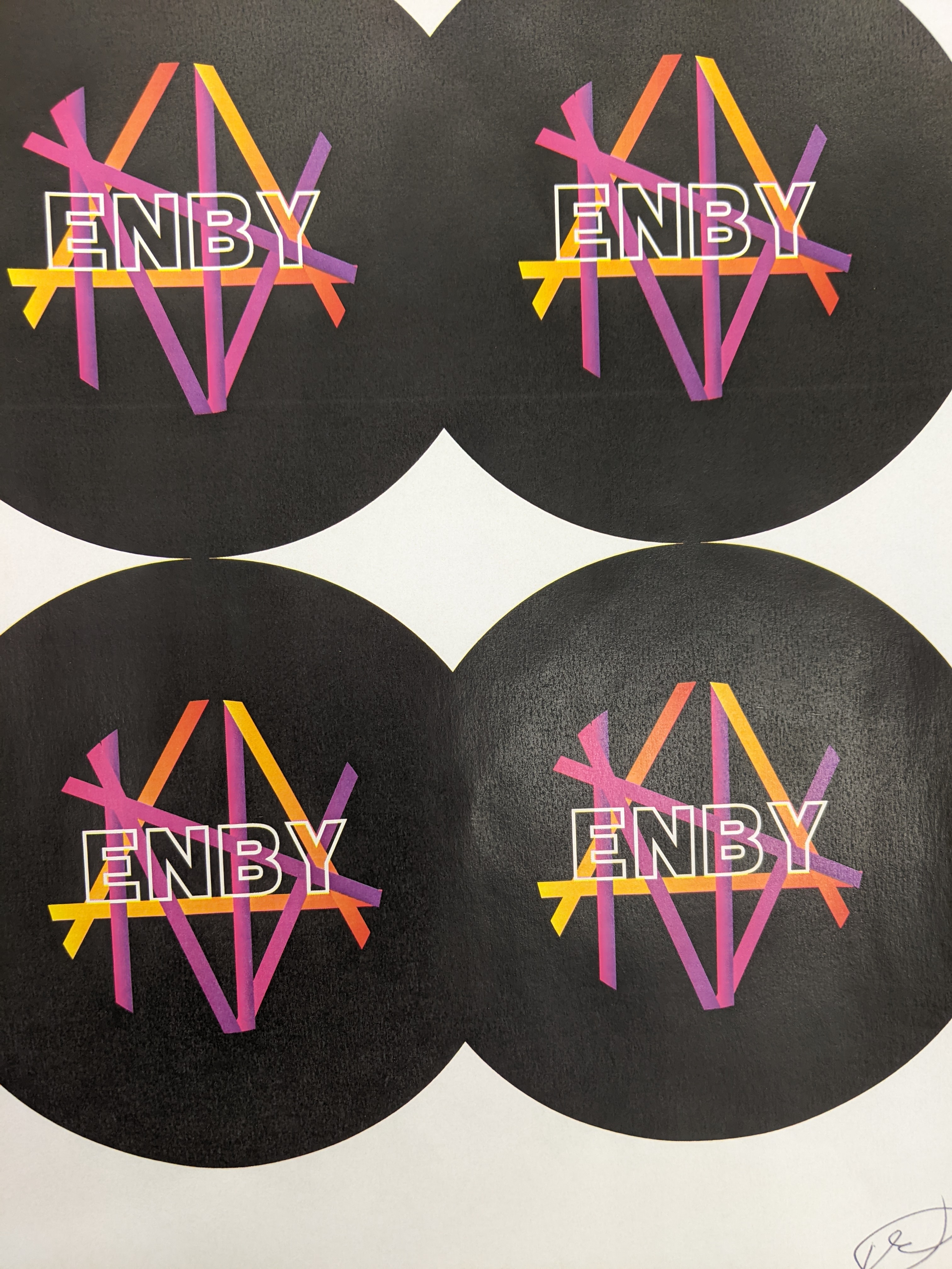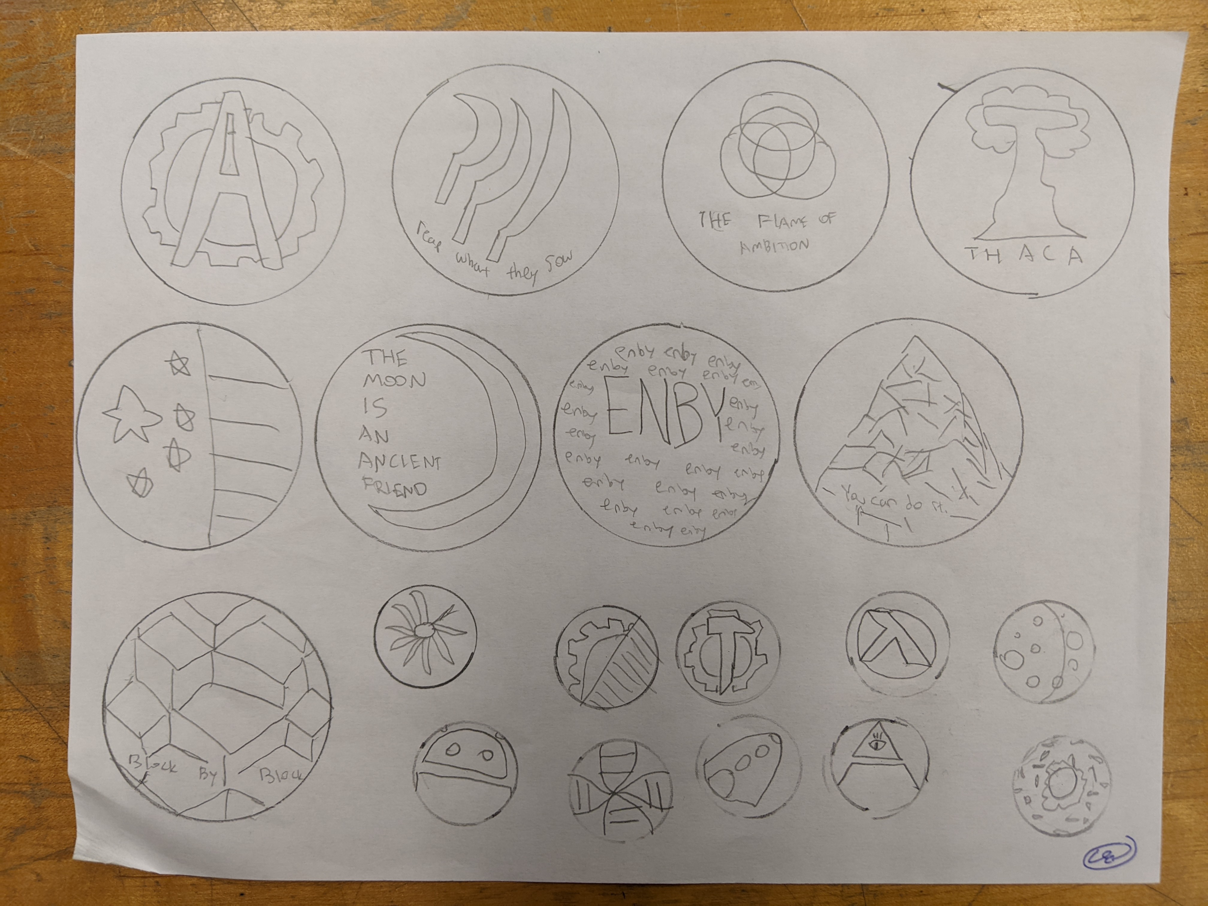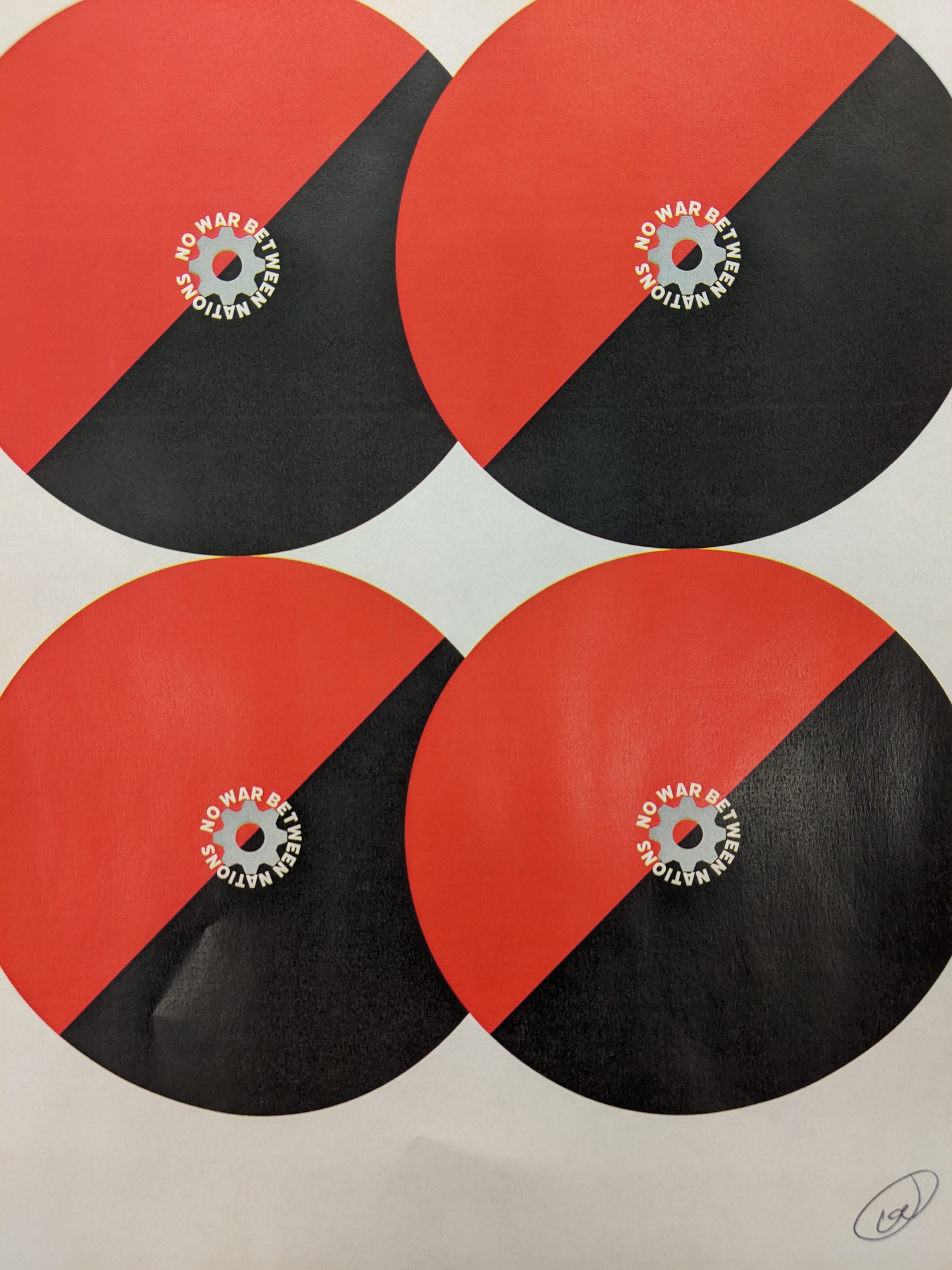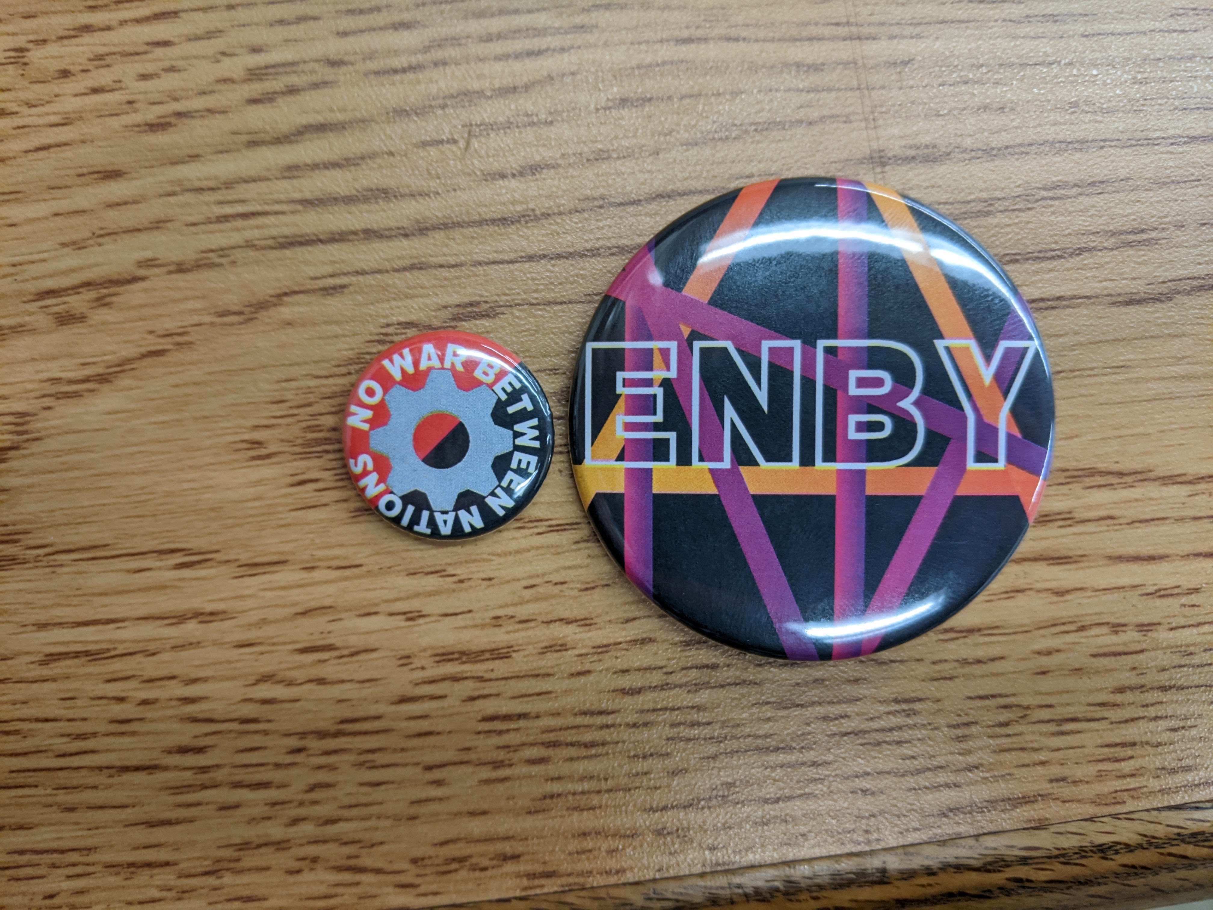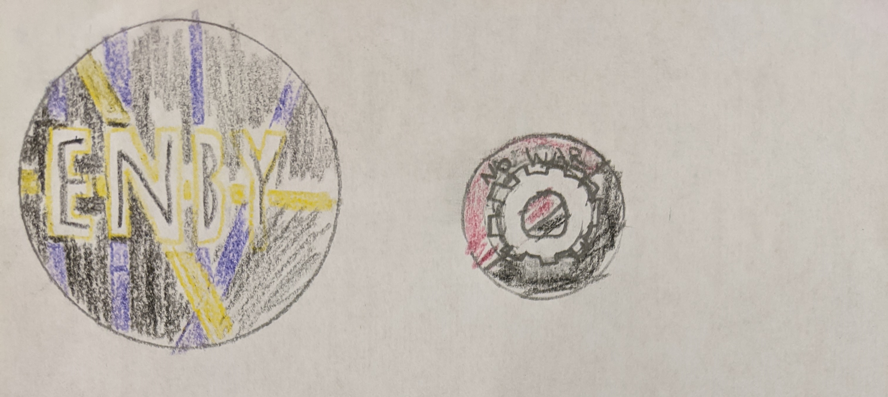 Buttonmaking was easier than Business Card Design in comparison. The tools you use to make the buttons: a paper cutter and a button maker, are way less mechanically intense than the hydraulic cutter. Just like my business cards, I diverged significantly from my final sketches once I got to illustrator. Perhaps this signifies an inability for me to stick to my own plans, or perhaps it simply means that I'm the type of person who constantly revises their ideas. The buttons came out neater than I thought they would be, and on center too! My large button proudly celebrates non-binary pride, and my smaller button has an anti-war message that seems particularly relevant right now.