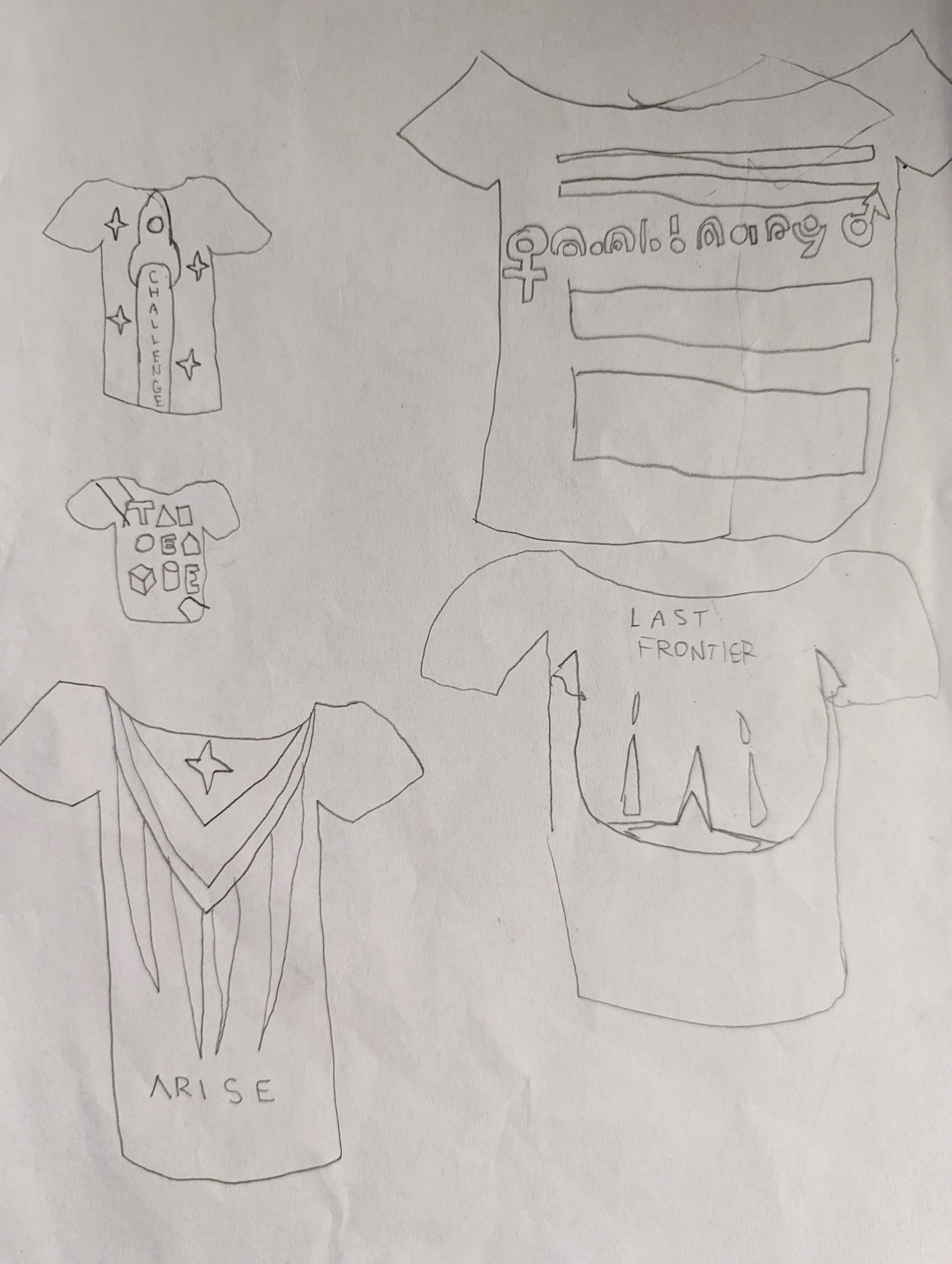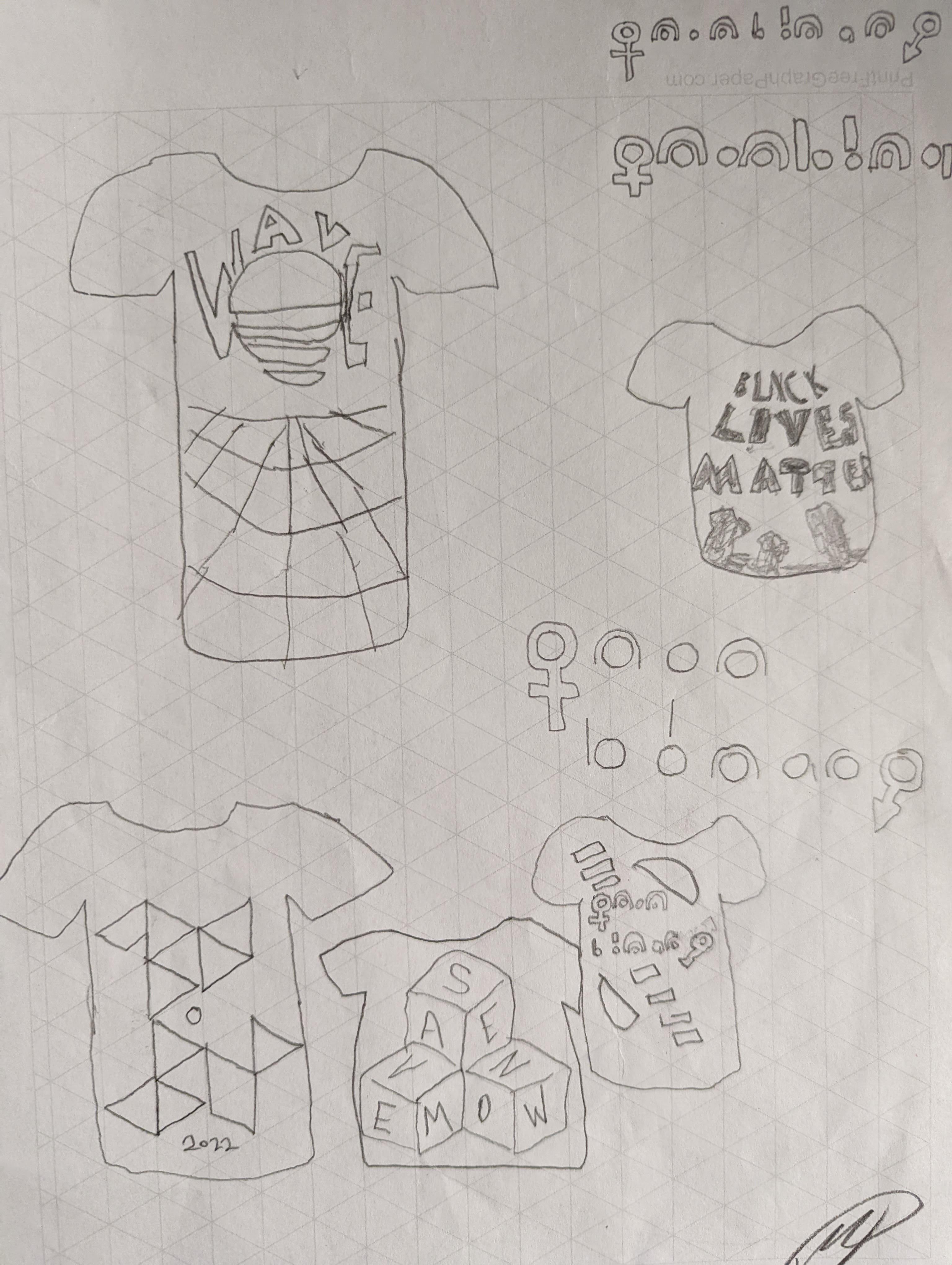 We started out the screenprinting process with brainstorming sketches. The sketches were done on the outline of T-Shirts to help us