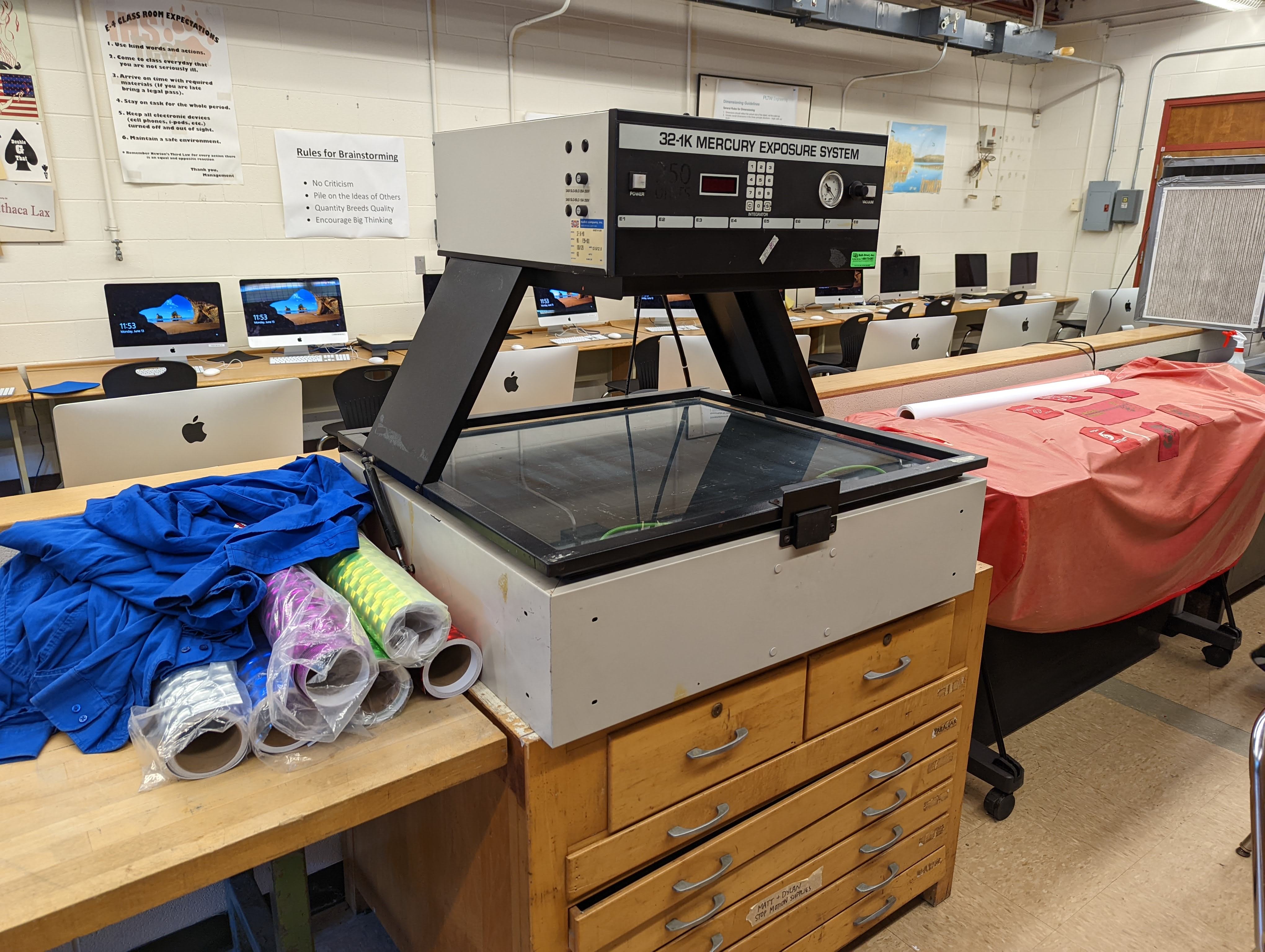 The mercury exposure unit imprints light through the transparency onto the stencil. This means that we can then rinse the stencil out using a high-powered hose.